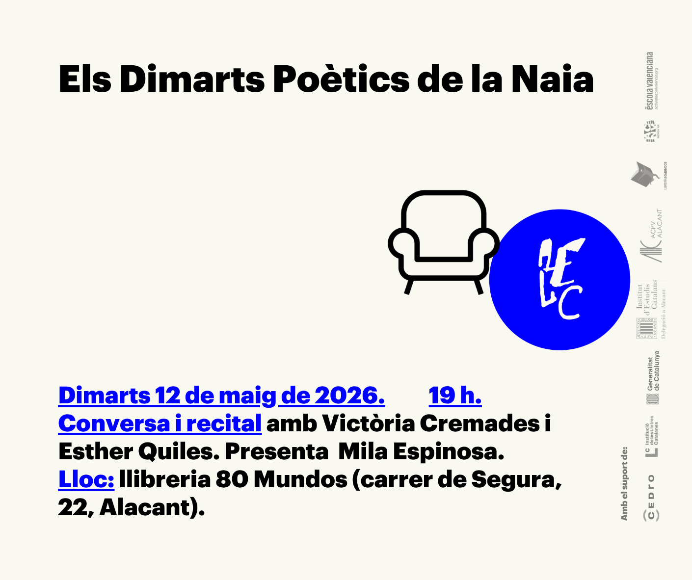 Conversa i recital amb Victòria Cremades i Esther Quiles. Serà a la llibreria 80 Mundos (carrer de Segura, 22) dins del cicle "Els Dimarts Poètics de la Naia". Activitat gratuïta i oberta a tothom.