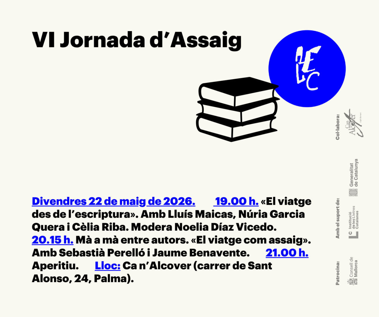 Aquesta activitat té el patrocini del Consell de Mallorca, el suport de la Institució de les Lletres Catalanes i la col·laboració de Ca n'Alcover.
