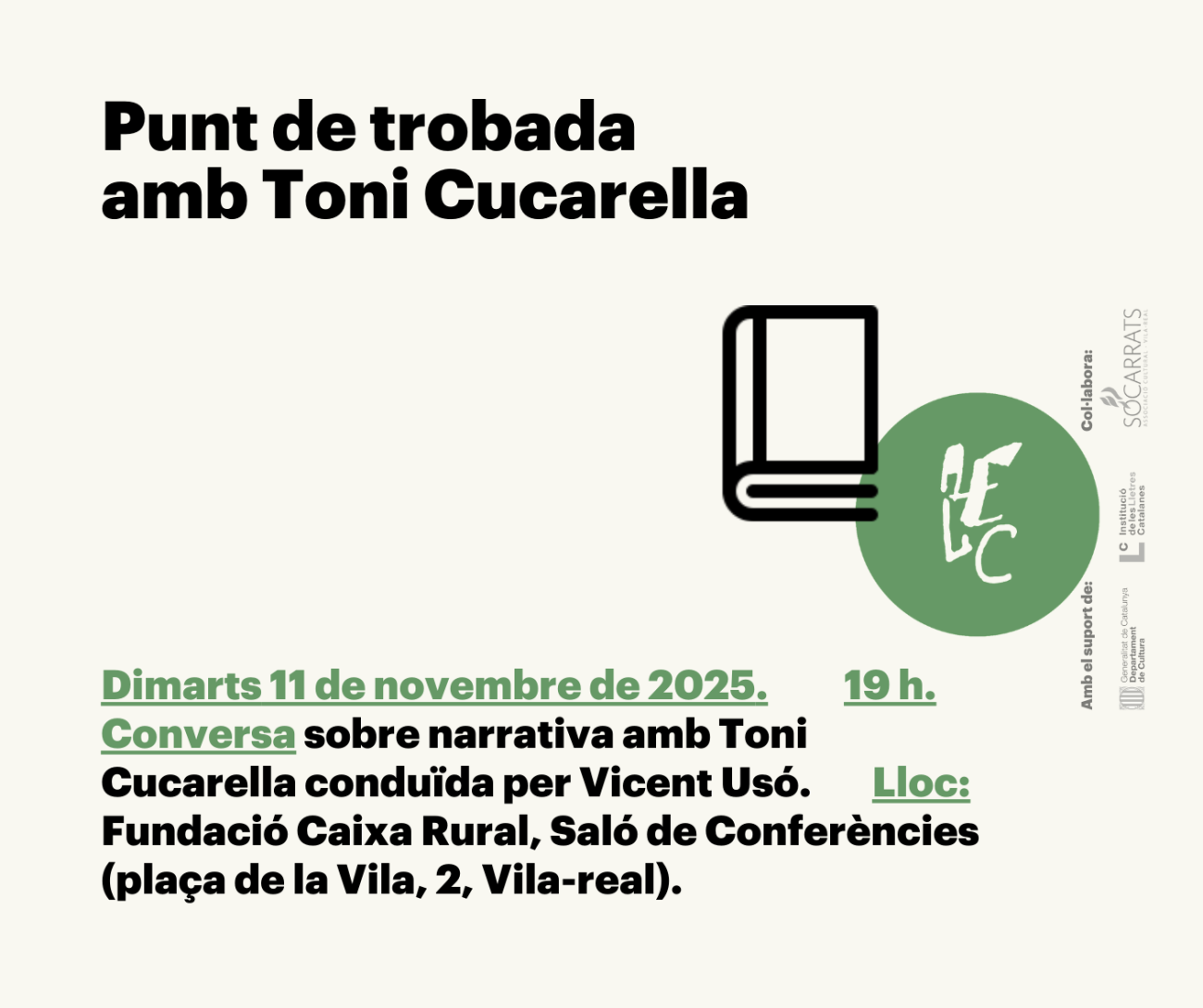 Conversa sobre narrativa amb Toni Cucarella conduïda per Vicent Usó. Serà a la Fundació Caixa Rural, al Saló de Conferències (plaça de la Vila, 2).