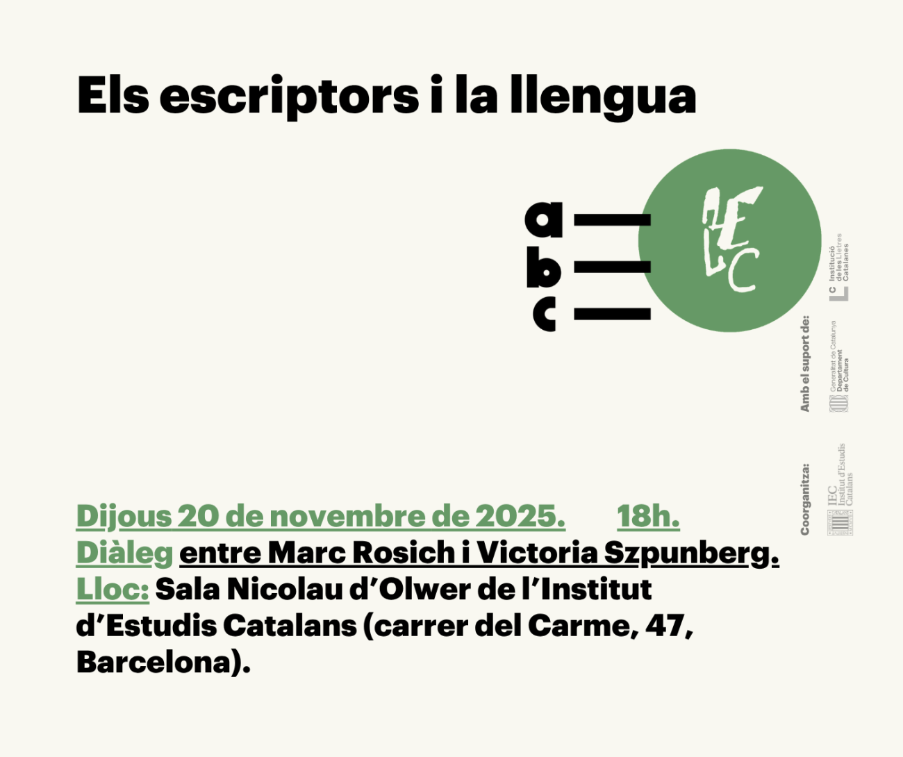 En aquest cas, es tracta d’un diàleg entre Marc Rosich i Victoria Szpunberg. També hi participen Nicolau Dols, president de la Secció Filològica; August Bover, president del Grup de treball de Llengua i Creació de la Secció Filològica, i Mireia Sopena, tresorera de l’AELC. L’acte se celebra a la Sala Nicolau d’Olwer l’IEC (carrer del Carme, 47).