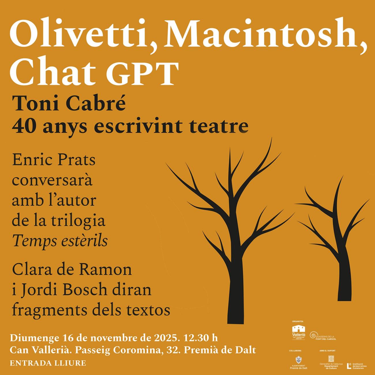 Enric Prats conversarà amb l'autor de la trilogia, que celebra els 40 anys de professió del dramaturg. L'acte tindrà lloc a Can Vallerià (passeig Coromina, 32).